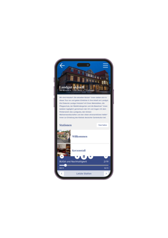 Bei uns wird kulturelle Bildung zum individuellem Klangerlebnis mit Aufenthaltsqualität. Unsere zum Ort passenden Hörstationen funktionieren als zukunftsfähiges Smart City Outterior, welches zum Verweilen einlädt und den Ort individuell repräsentiert. Sie geben niedrigschwellig auf Knopfdruck Audioteaser wieder und verweisen auf tiefergreifende digitale Inhalte: Die Guideapp liefert verschiedene GPS-getrackte Touren, hierfür bieten wir hochqualitative Contentproduktion an.